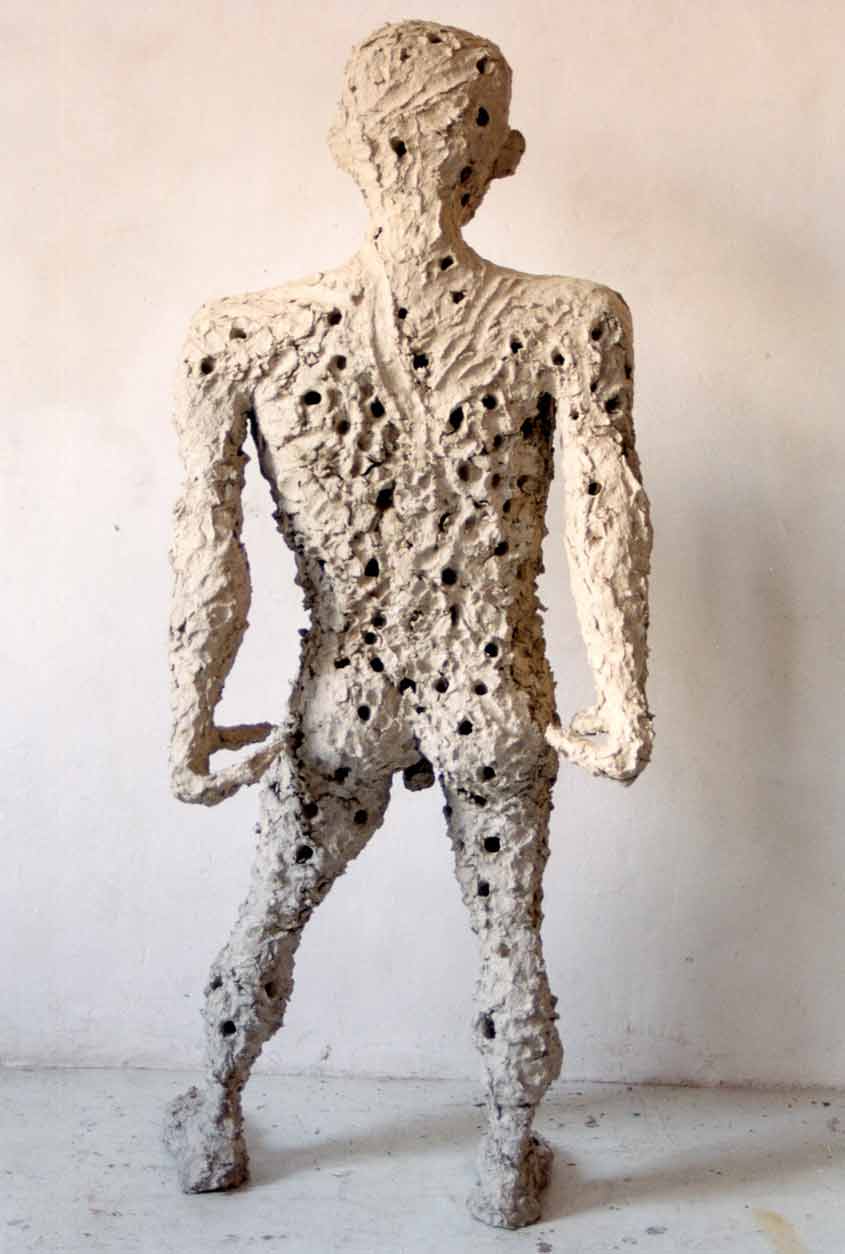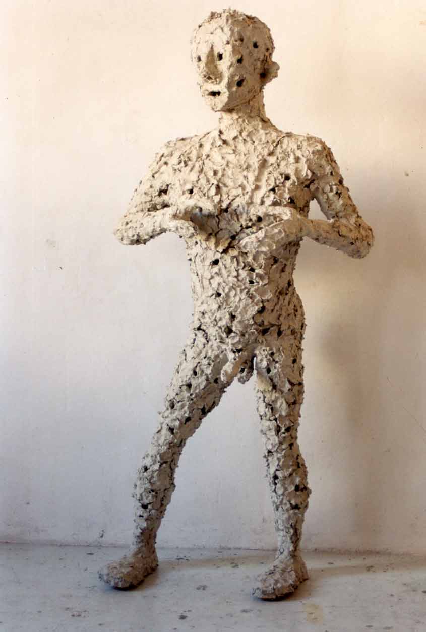 In 1992 had ik een goede reden mezelf opnieuw uit te vinden. Want ik was al bijna twintig jaar volwassen, en het beviel niet. Ik beviel mezelf niet. Het was hoog tijd mijn schilderskwasten aan de wilgen te hangen. Maar hoe doe je zoiets? Mijn toenmalige geliefde, moeder van mijn zoon, gaf me een stuk papier-maché in handen. ‘Kun jij hier iets mee?’, vroeg ze. Ik maakte er een kopje van en stak er een stel penselen in: het haar. Toen twee doppen van verftubes voor de ogen. Het deksel van een verfblik werd de mond. Een neus had hij niet. Het zag er uit als een kinderlijk ding. Mijn bevrijding kon beginnen.