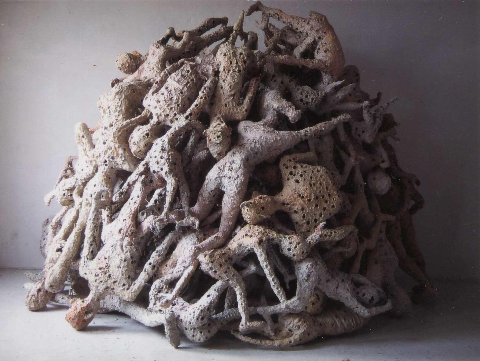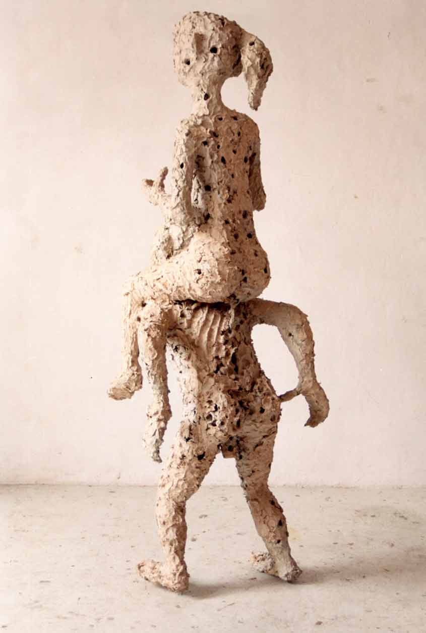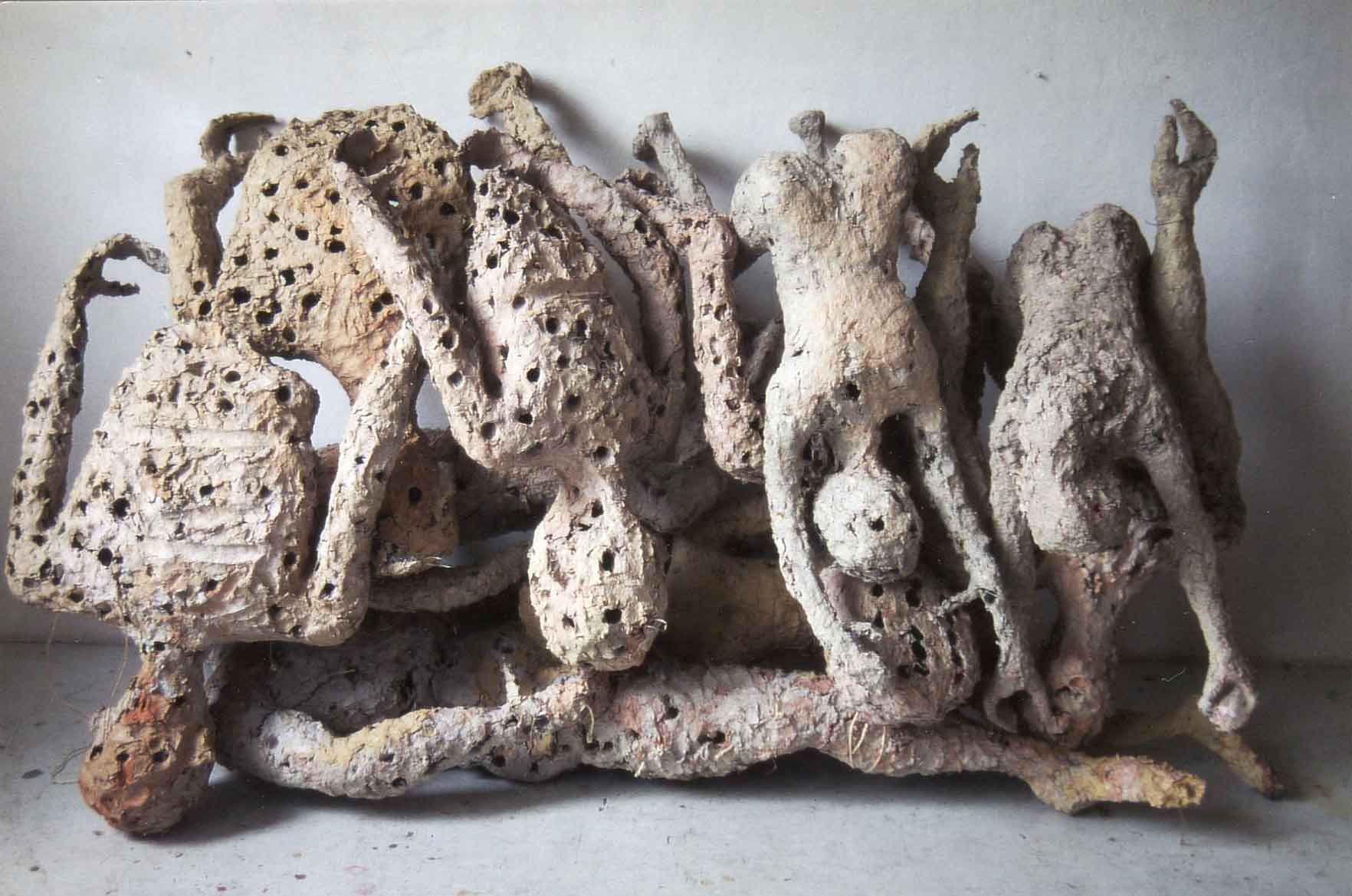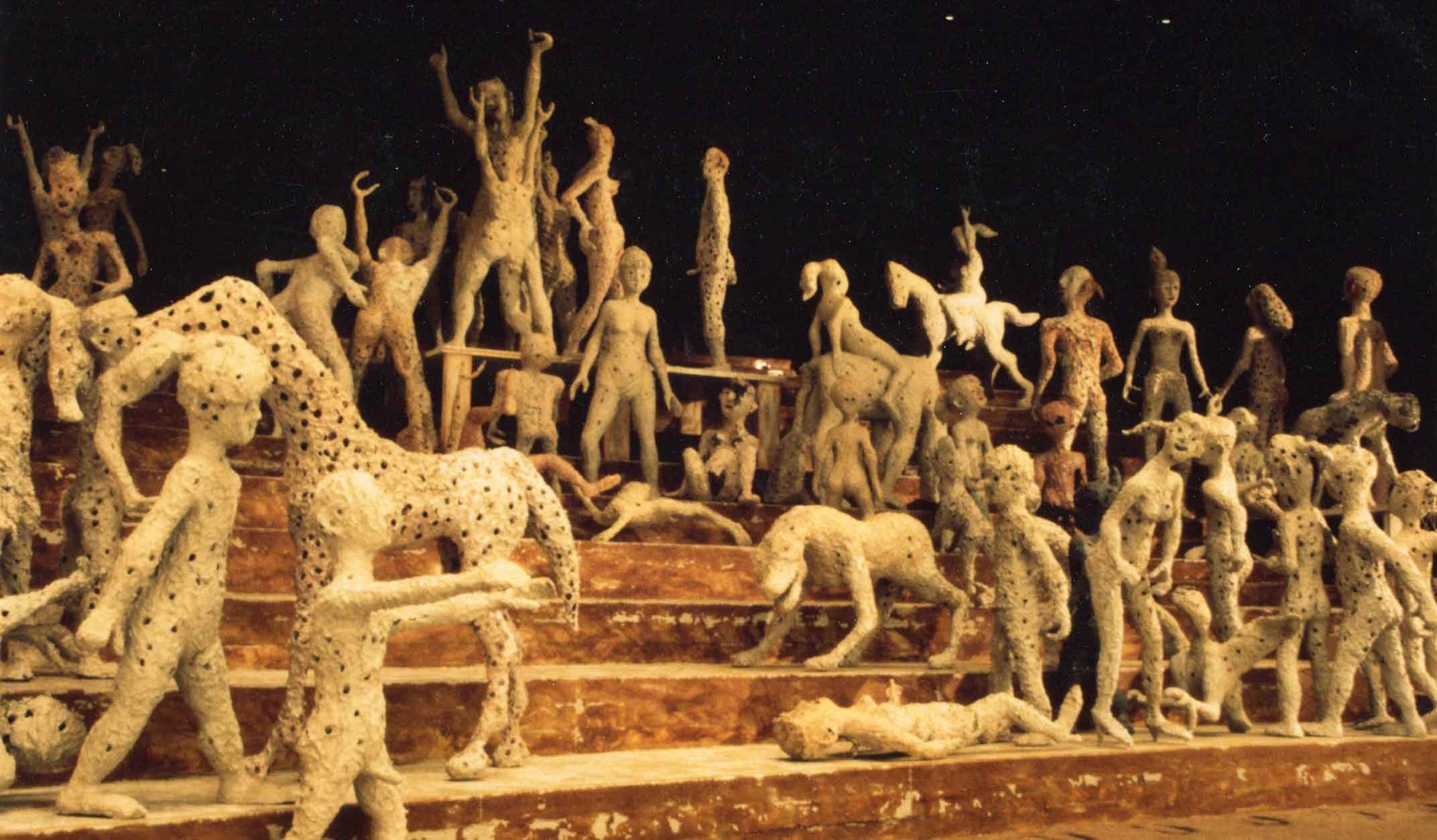 ‘Zo’n honderd papier-maché figuren, mannen, vrouwen en dieren staan als een soort tableau-vivant opgesteld in de tentoonstellingsruimte. Hun verstilde grijns, hun opgegeven armen en hun lijven vol gaten geven het geheel iets lugubers, alsof je zomaar een andere wereld bent binnengestapt. Een wereld waarin de mensen anders leven en een andere taal spreken. Van contact maken met deze figuur is dan ook geen sprake.’