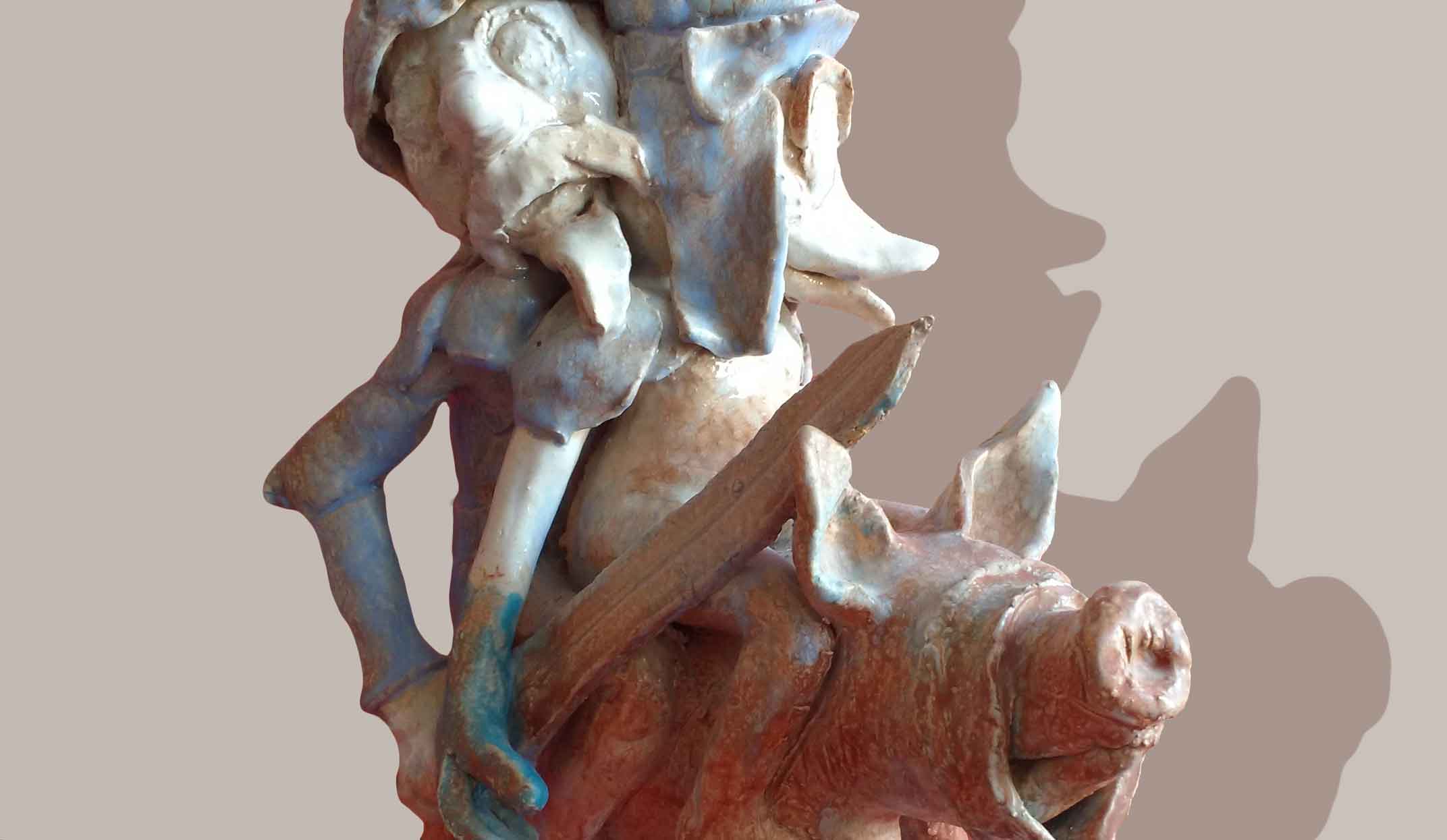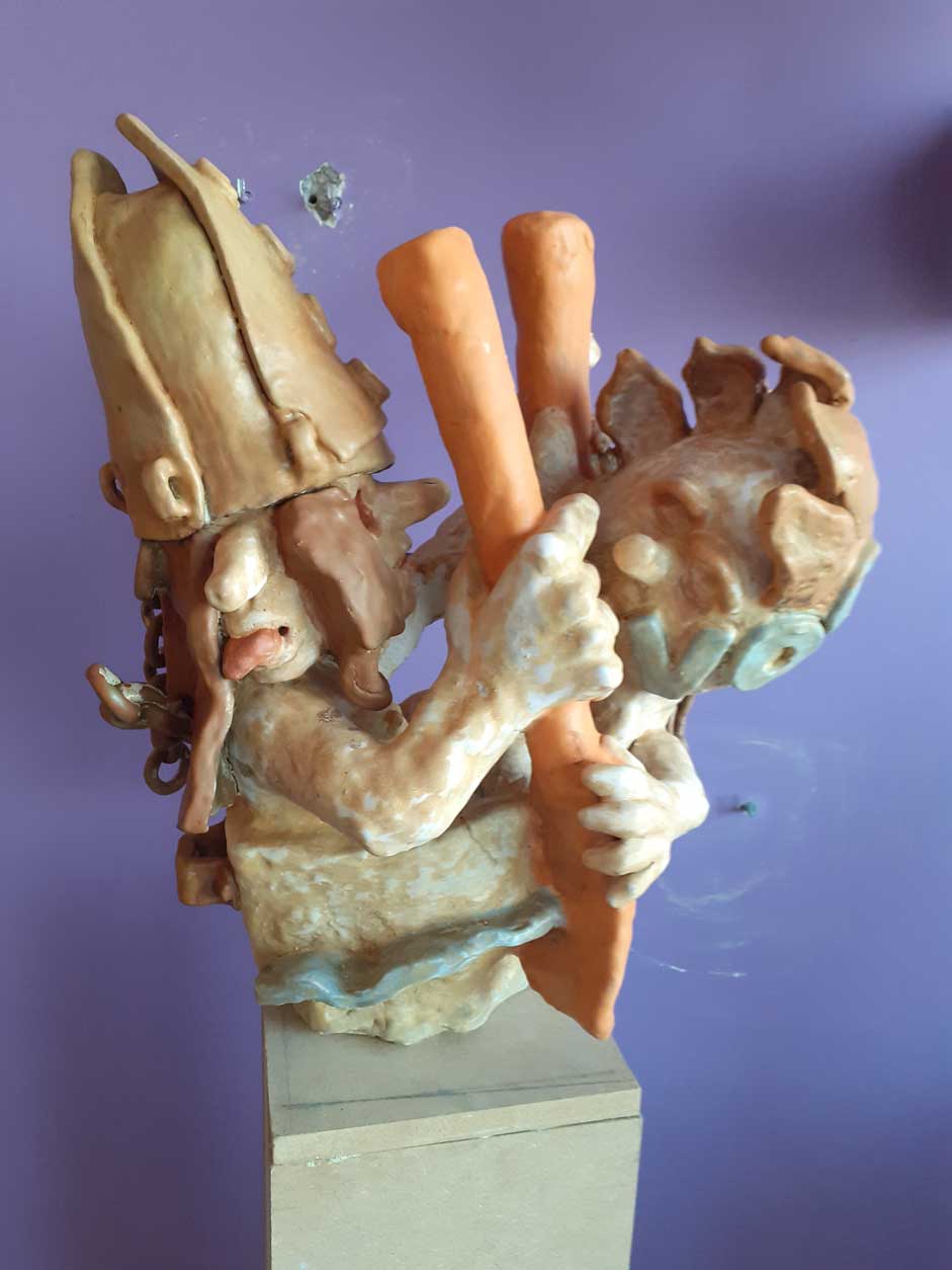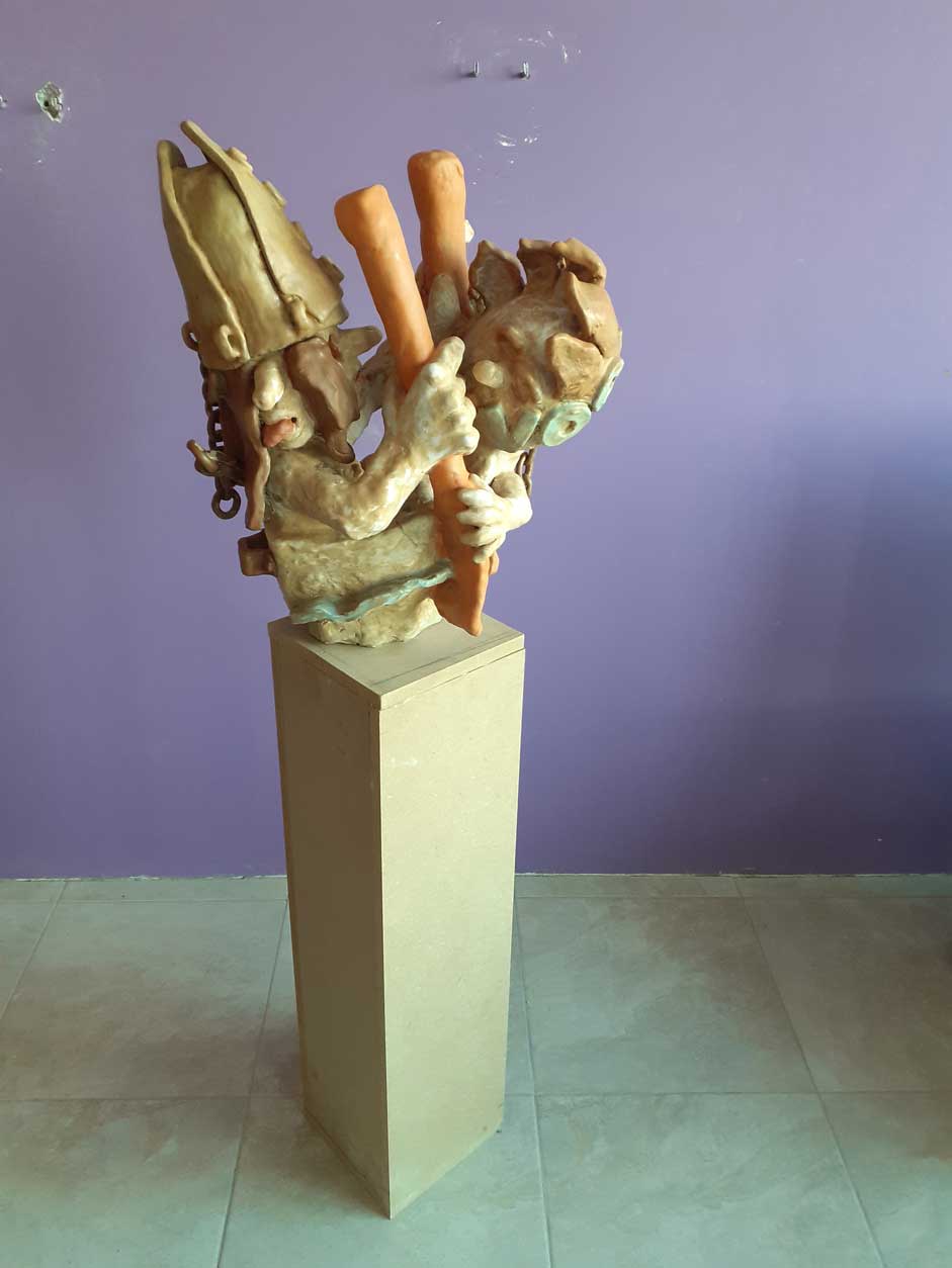 Na jarenlang geschilderd te hebben was de kwast ‘opgedroogd’. Ik vond nieuwe inspiratie door te werken met ander materiaal. Eerst was daar Pygmalions Kroondomein, een ruimtelijk project met beelden van papier-maché. Daaruit volgde een tweede project, Pygmodys. De thematiek van Pygmodys leeft voort in het huidige project Steengoed.