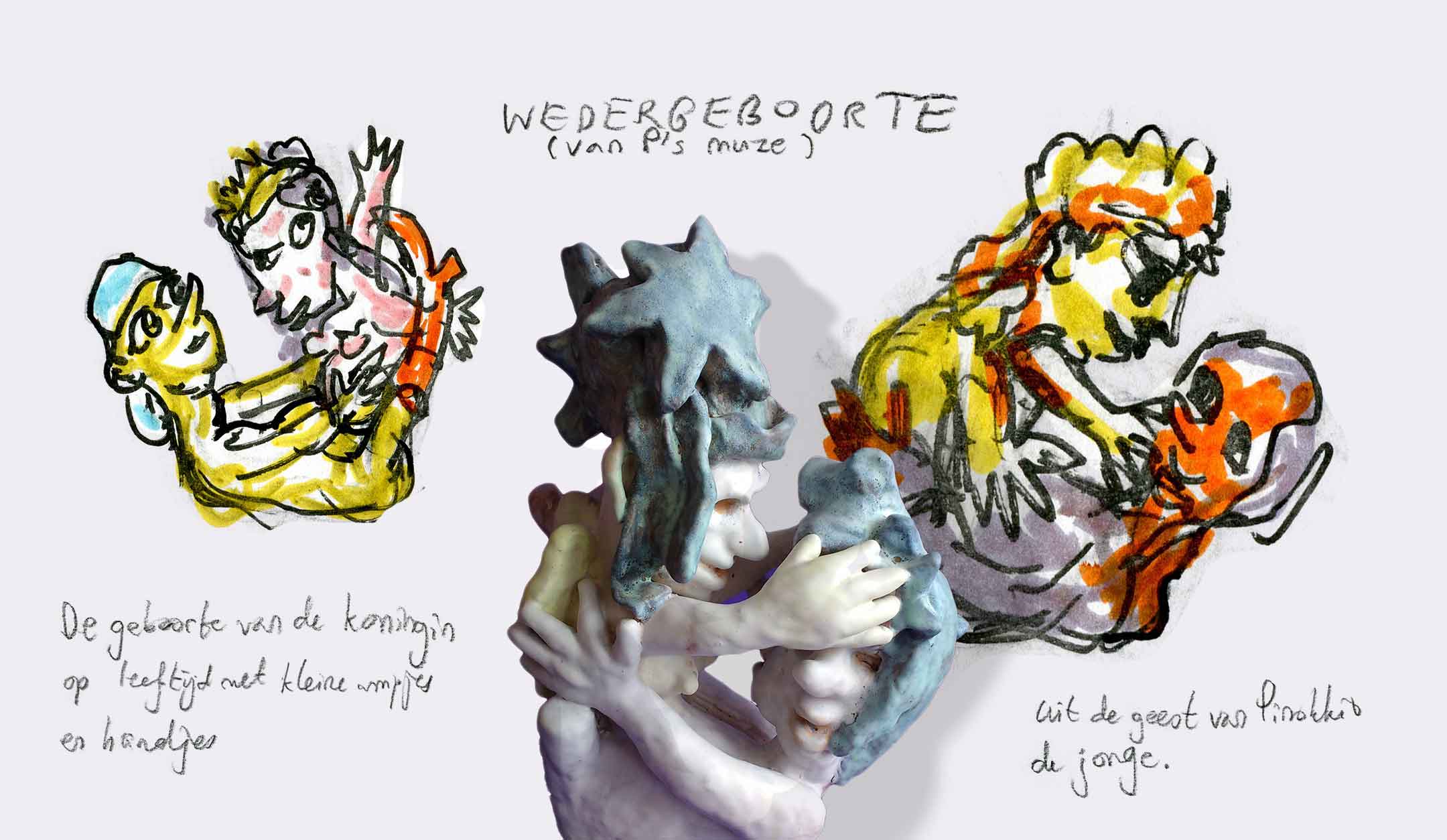Pinokkio's neus van Peter, als lustprincipe van mijn steengoed-verbeelding. In De Bevallingen van P. breng ik de held terug tot een stenen bolletje. Met stompjes, nauwelijks beentjes. Ik laat de schepping welbewust opnieuw beginnen. Laat een fantasie bevallen van zijn doodstille steengoedfantasie.