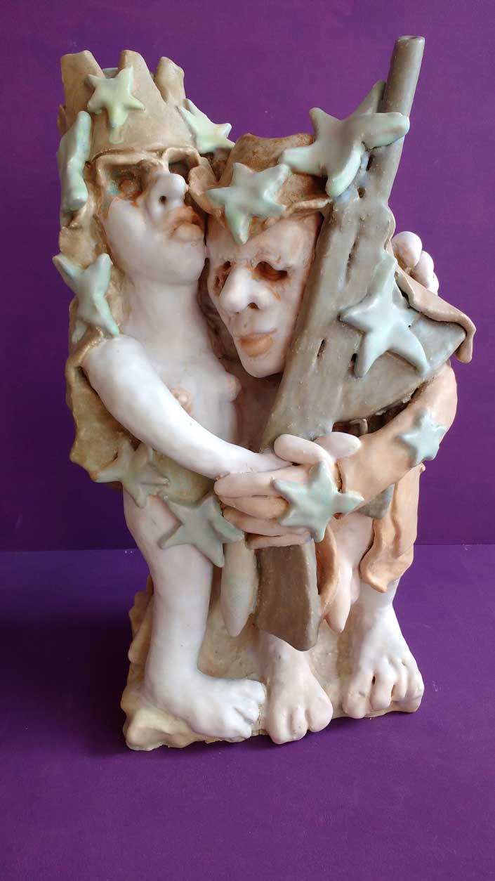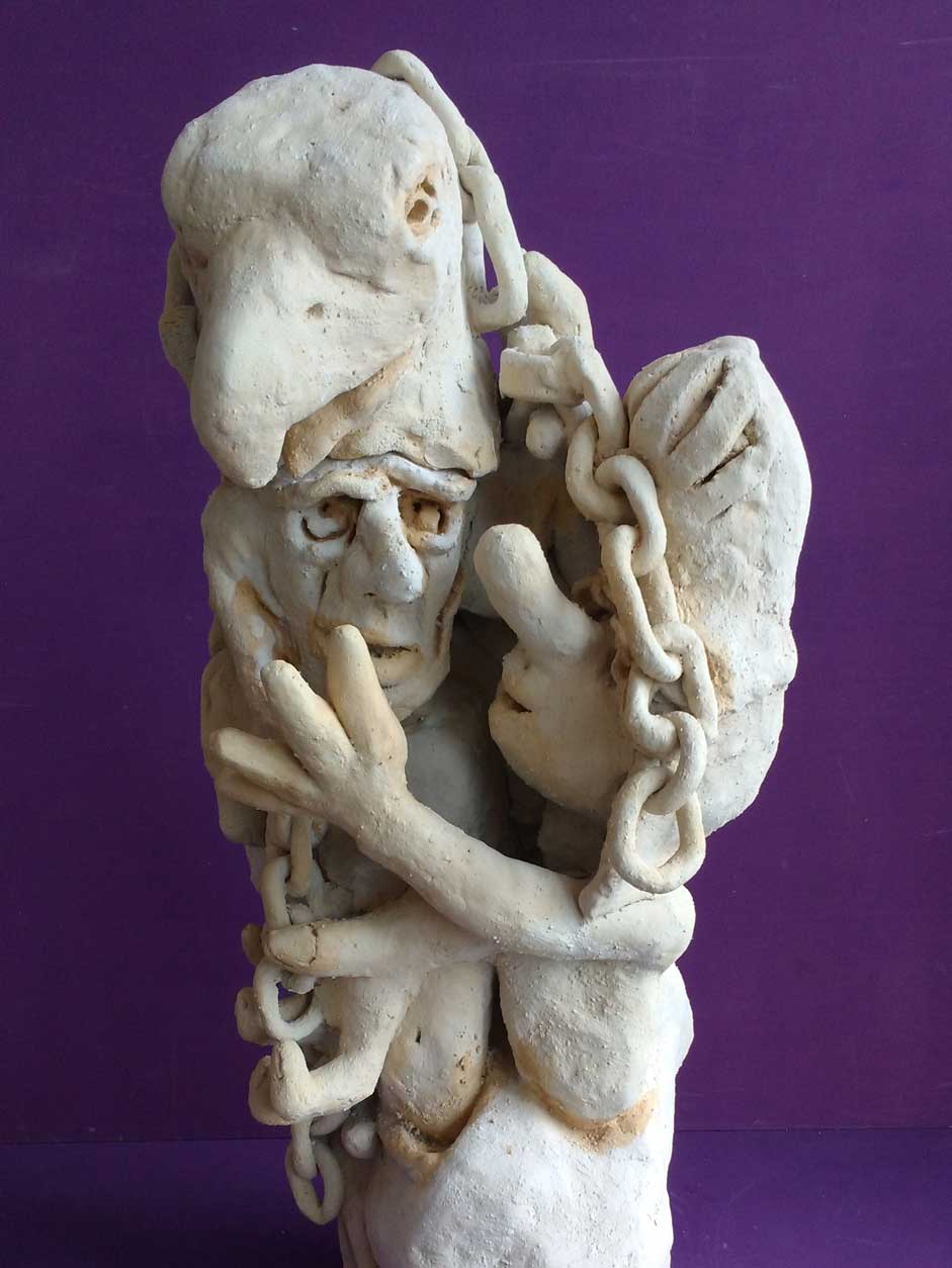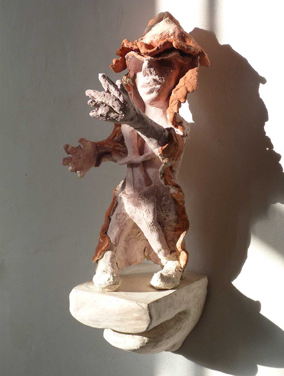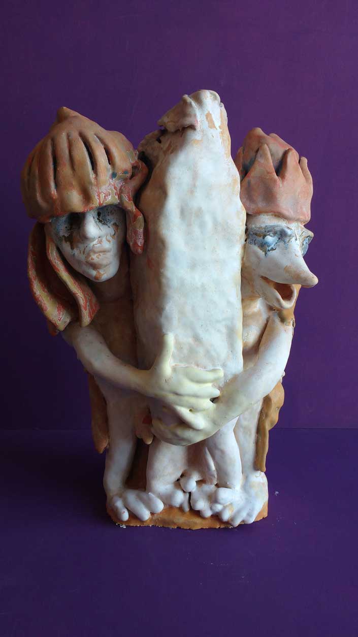 Met deze karikaturale figuren begon mijn steengoedproject. Toen ik met de pieken en dalen van mijn midlife worstelde was het alsof ik in de duistere Middeleeuwen en mythologische werelden verdwaalde. Als stand-ins voor mijn emoties staan deze wachters met hun rug naar de muur, op rotsvormige sokkels alsof ze op klippen voor een afgrond staan. Ze maken, ongeduldig of angstig, een pas op de plaats. Zou dat ook voor mij gelden? Ben ik wel goed bezig? Ben ik nog trouw aan mezelf? Waar gaat dit heen? Hoe ga ik mijn eigenheid bewaken?