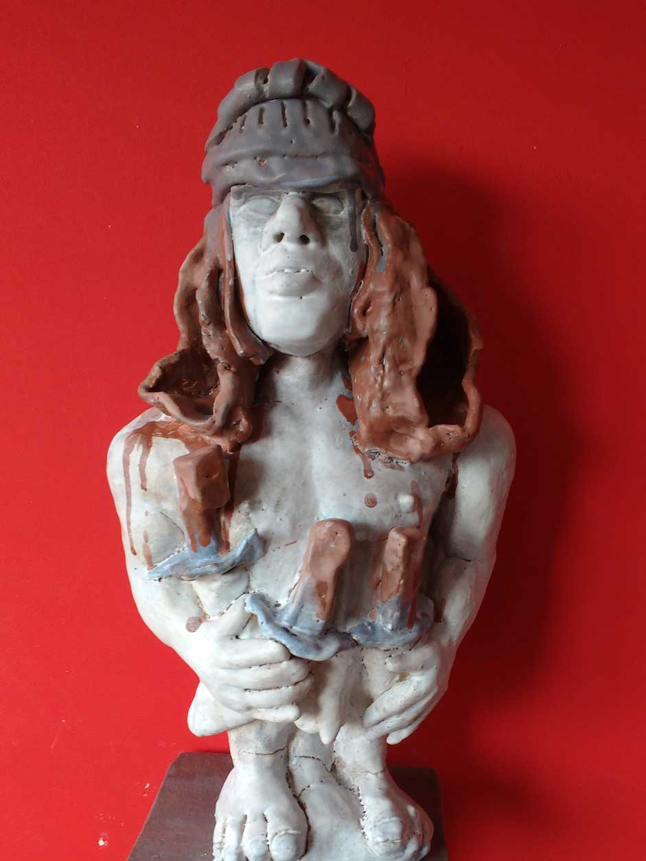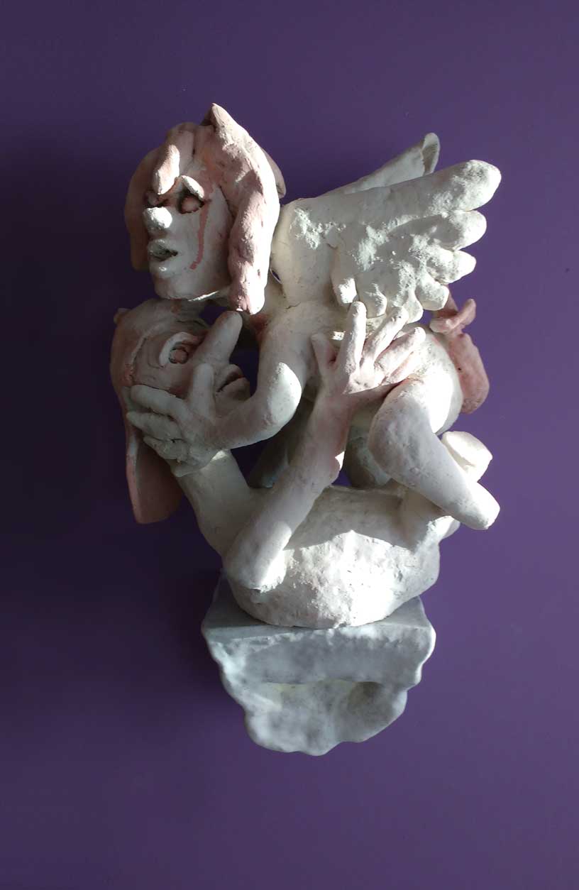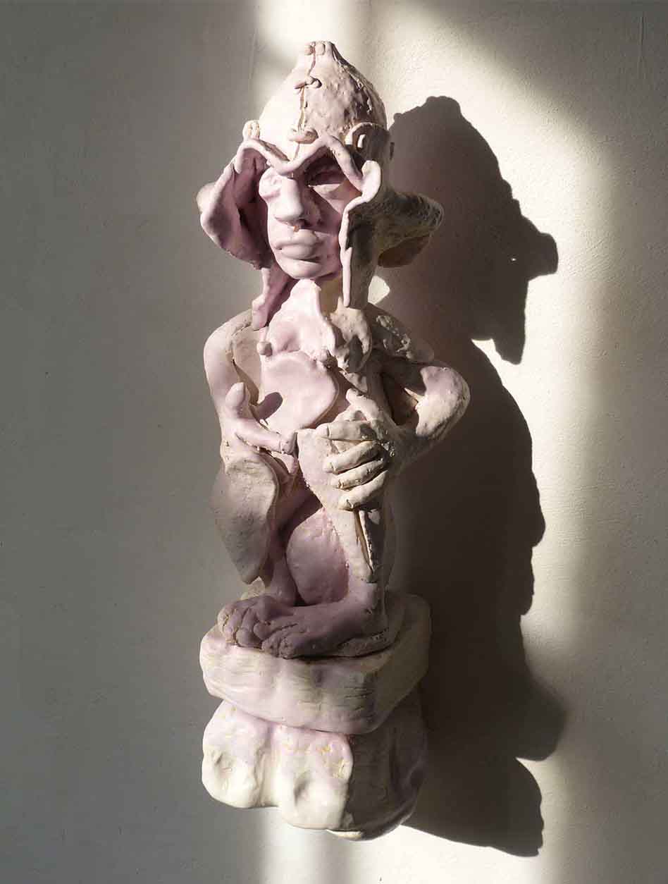 Met deze karikaturale figuren begon mijn steengoedproject. Toen ik met de pieken en dalen van mijn midlife worstelde was het alsof ik in de duistere Middeleeuwen en mythologische werelden verdwaalde. Als stand-ins voor mijn emoties staan deze wachters met hun rug naar de muur, op rotsvormige sokkels alsof ze op klippen voor een afgrond staan. Ze maken, ongeduldig of angstig, een pas op de plaats. Zou dat ook voor mij gelden? Ben ik wel goed bezig? Ben ik nog trouw aan mezelf? Waar gaat dit heen? Hoe ga ik mijn eigenheid bewaken?