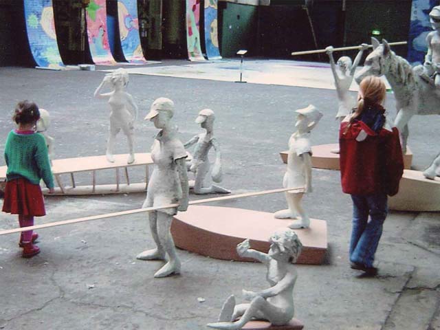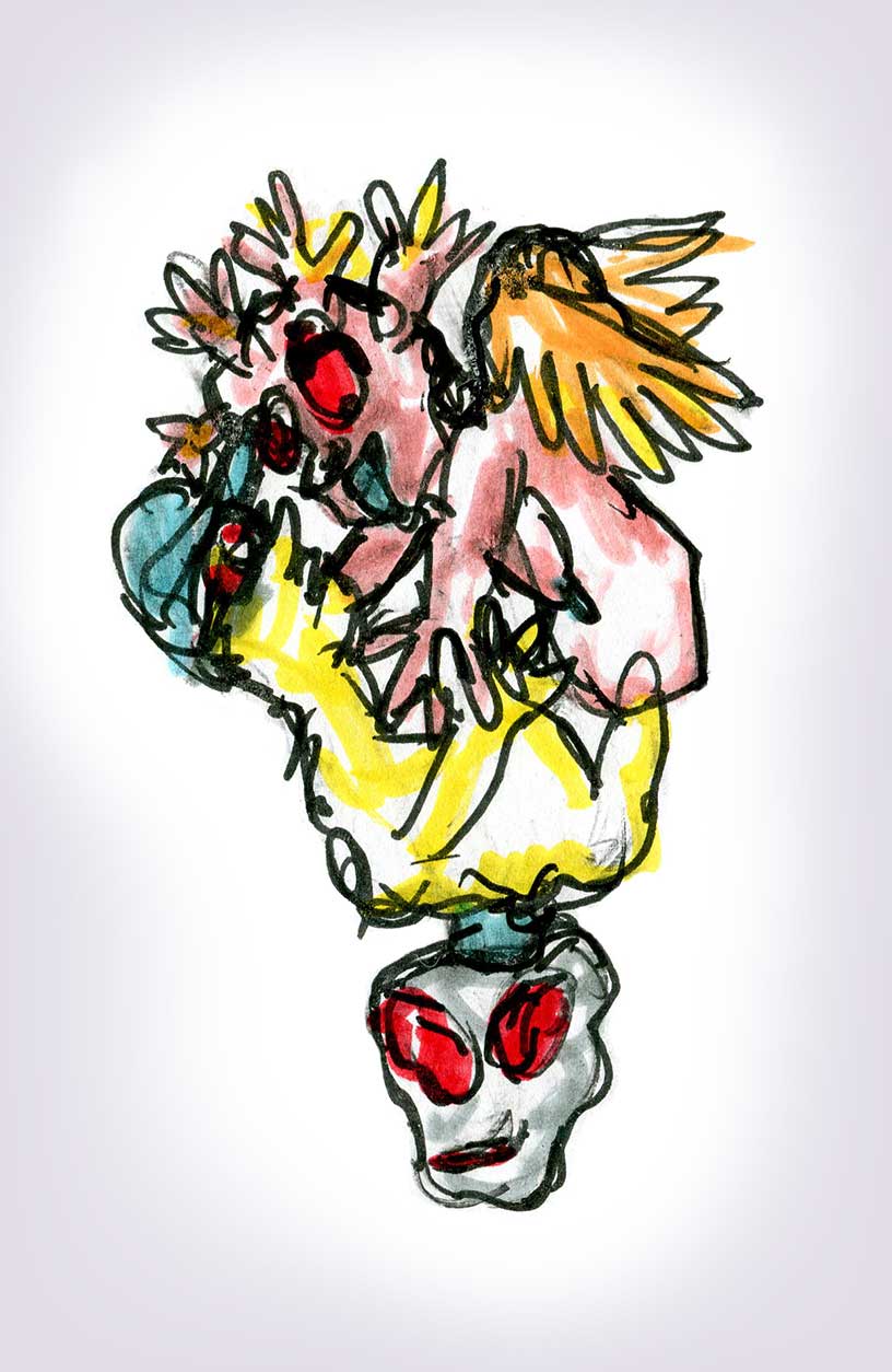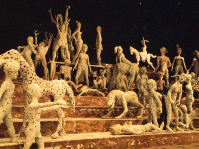 Zijn dit de helden van de avontuurlijke geest met een tragisch randje die me voor ogen staat? Er zijn veel helden en heldinnen in mijn werk. Allemaal karikaturen van menselijkheid. Te grote handen, klein hoofd, of andersom. Zeer korte pootjes, vaak maar drie of vier tenen aan die aandoenlijke naakte tenen. Armzalig bewapend en gepantserd. Stuk voor stuk van hun voetstuk gevallen versteende geesten.